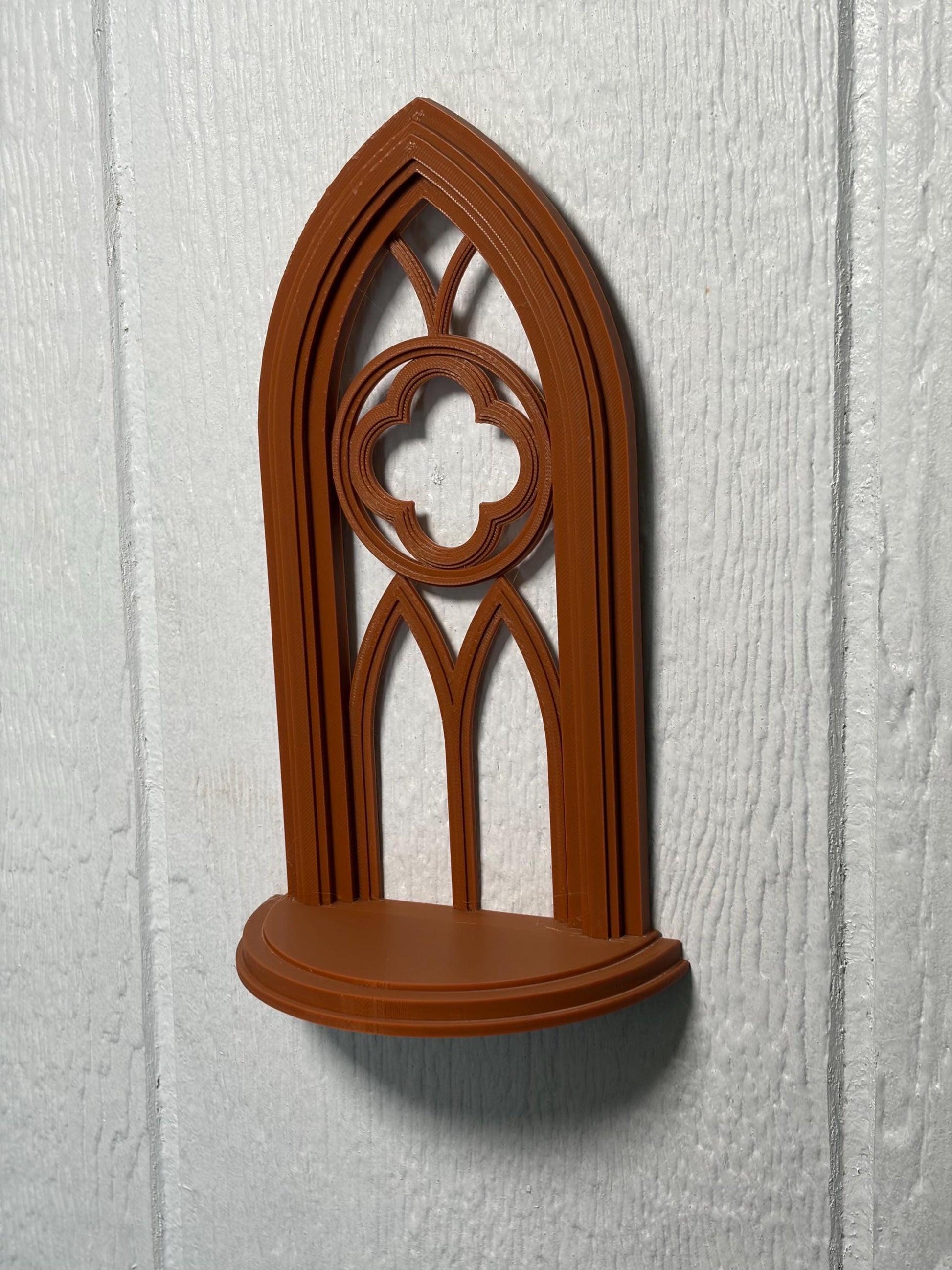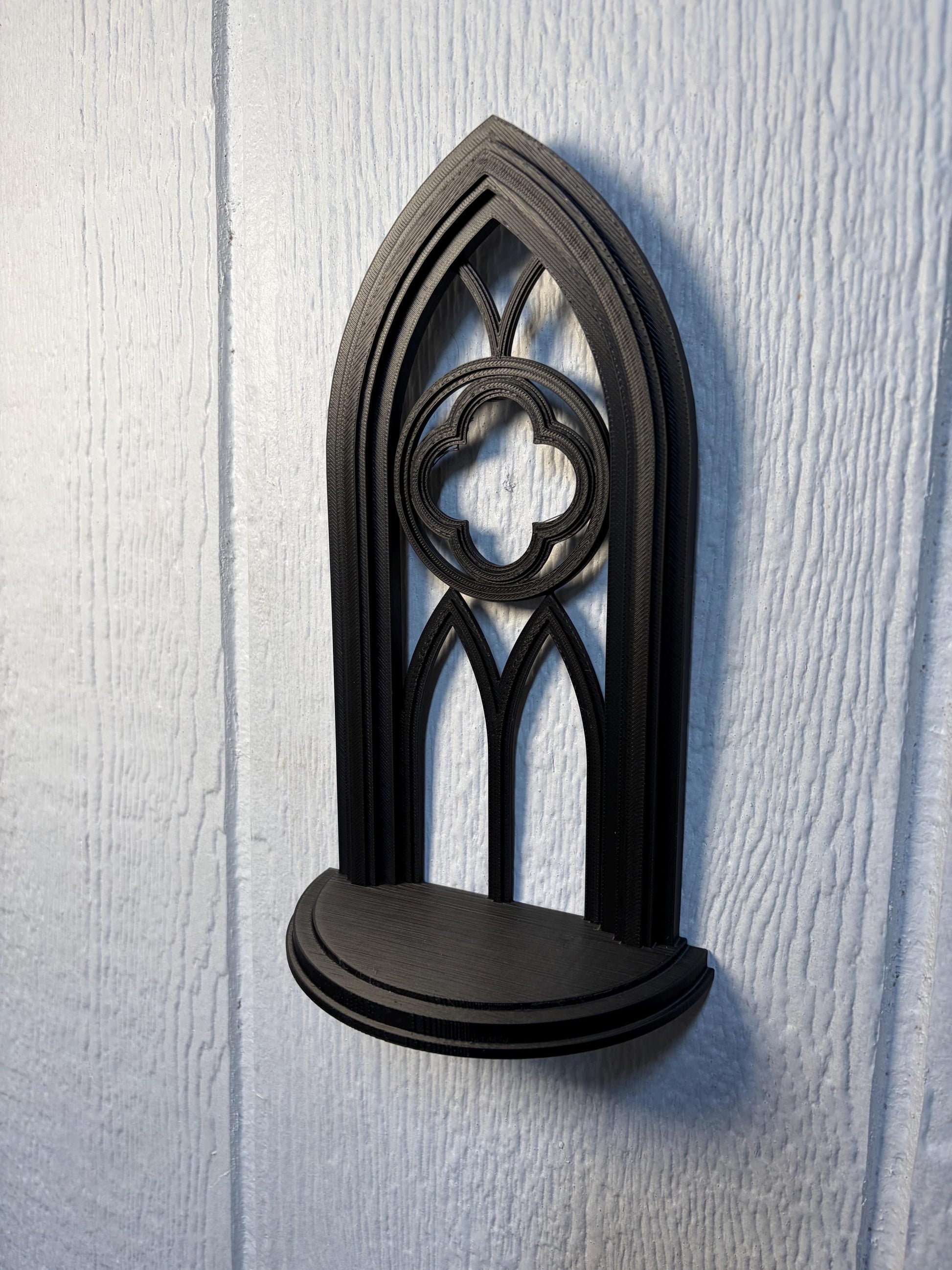 Transform your sacred space into a realm of shadowed elegance with this hauntingly beautiful 3D-printed Gothic altar shelf. Inspired by cathedral arches, Victorian spires, and occult ornamentation, this raised relief design features intricate gothic details that create dramatic shadows and texture under candlelight.