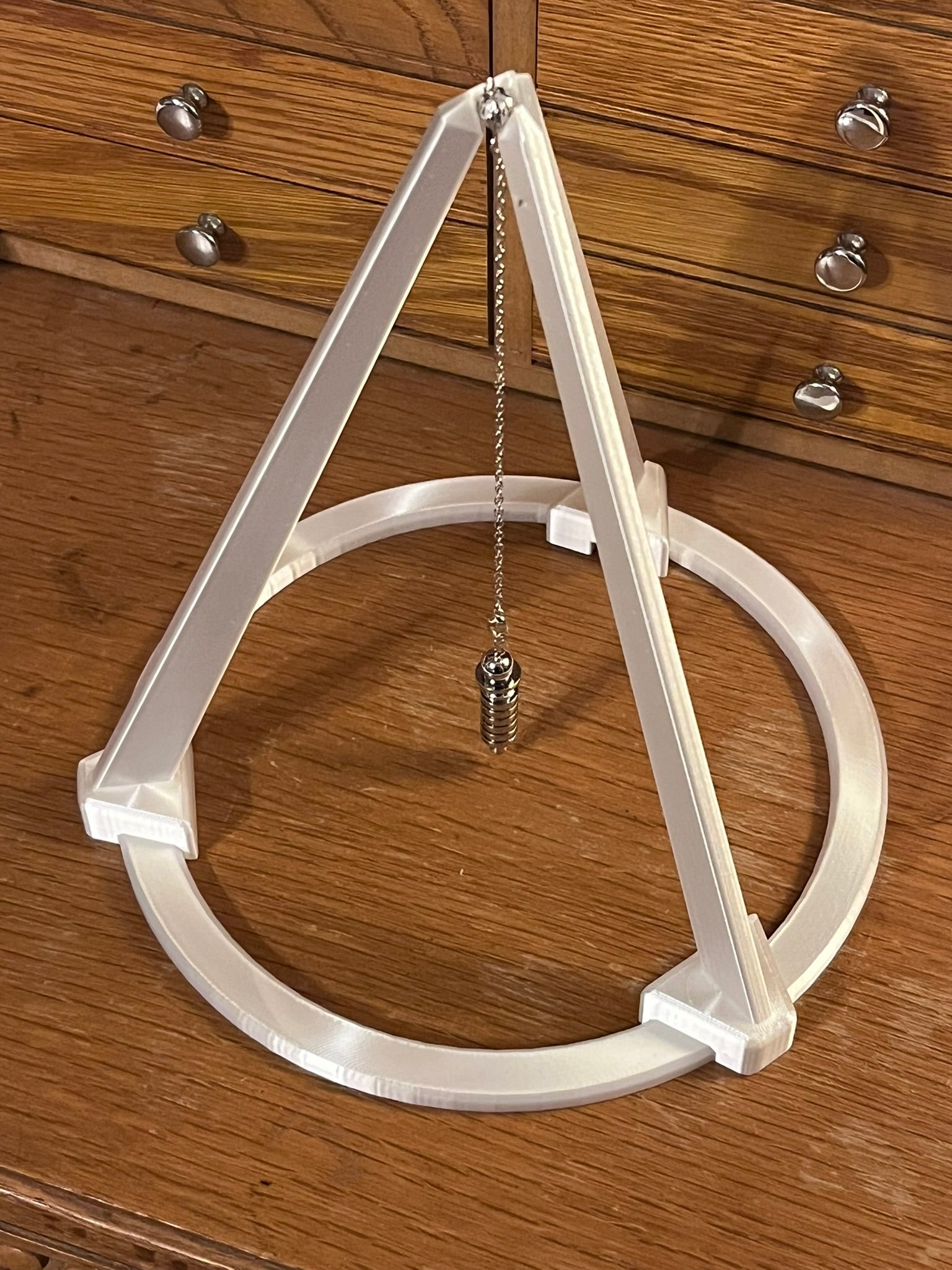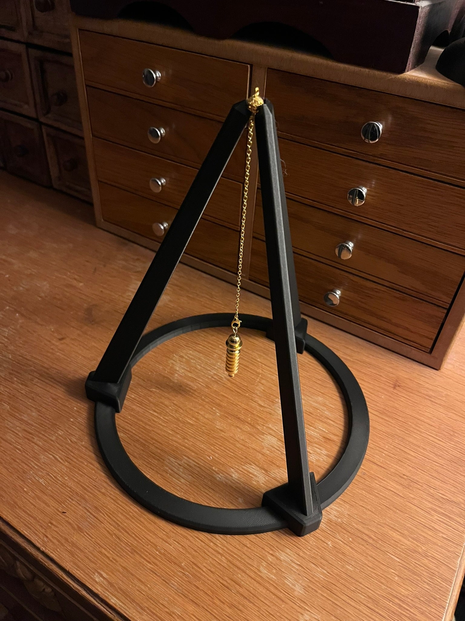 The Tripod is 9 inches wide, allowing the user to use the Tripod with Dowsing Boards, Maps, Photos and Sigil Plates. The Stand is 9 inches tall and is able to accommodate many different dowsing devices, including cords, chains, Silks and Leather Straps.
