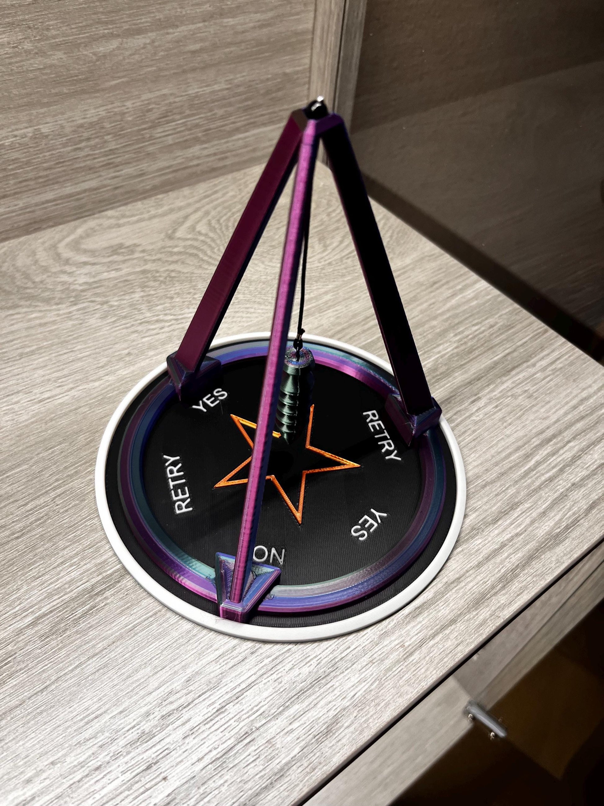 Open Base 3D Printed Tripod Stand and Pendulum. 5 1/2 inches wide by 6 inches tall. Includes Divination Board